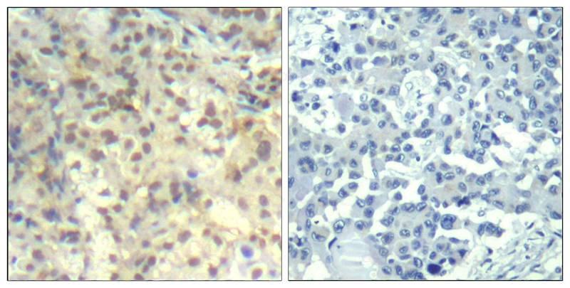 Figure 1: Immunohistochemical analysis of paraffin-embedded human lung carcinoma tissue using cofilin1(Phospho-Tyr139) Antibody 35-1304 (left) or the same antibody preincubated with blocking peptide(right).