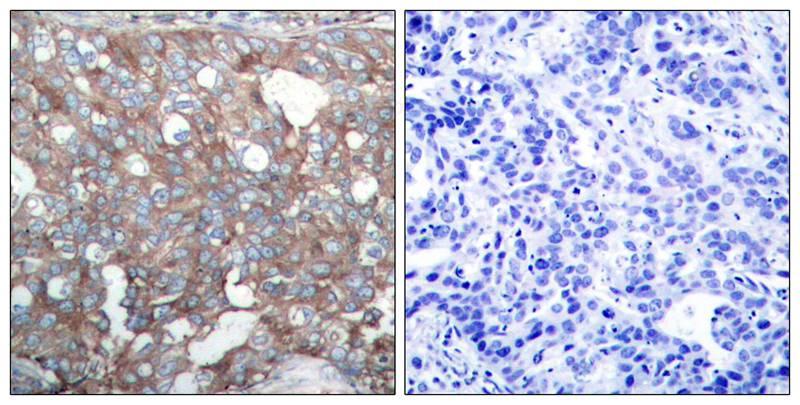 Figure 1: Immunohistochemical analysis of paraffin-embedded human breast carcinoma tissue using Cortactin(Ab-421) Antibody 35-1596 (left) or the same antibody preincubated with blocking peptide(right).