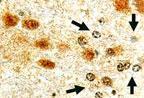 Fig:1 Immunohistochemical analysis of Cre in a formalin-fixed, paraffin embedded tissue section from the hippocampus of a Cre transgenic mouse using 20-1059 at 1:2000. In this mouse line, Cre is expressed in the brain, predominantly in the nuclei of most types of neurons. Hematoxylin-eosin counterstain. Arrows point to negative glia.