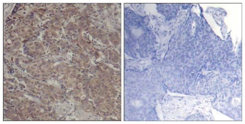 Figure 1: Immunohistochemical analysis of paraffin-embedded human breast carcinoma tissue using CREB(Ab-142) Antibody 35-1626 (left) or the same antibody preincubated with blocking peptide(right).