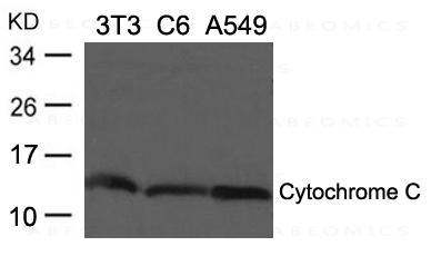 Figure 1: Western blot analysis of extracts from 3T3, C6 and A549 cells using Cytochrome C Antibody 35-1848 .