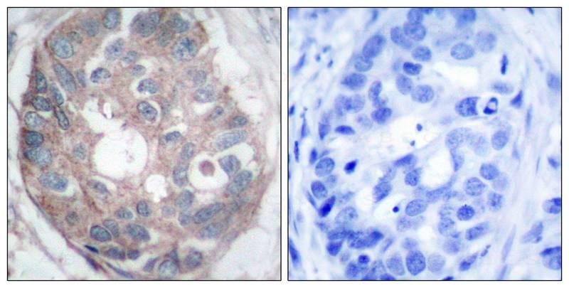 Figure 1: Immunohistochemical analysis of paraffin-embedded human breast carcinoma tissue using Dab1(Ab-232) Antibody 35-1584 (left) or the same antibody preincubated with blocking peptide(right).