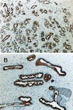 Fig:1 Formalin-fixed paraffin-embedded tissue sections of human prostate cancer (A and B) stained for Daxx expression using 20-1060 at 1:2000. Hematoxylin-eosin counterstain.