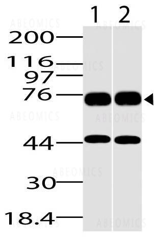 Fig-1: Western blot analysis of DDX18. Anti-DDX18 antibody (11-8076) was used at 4 µg/ml on 1) MOLT-4, 2) Jurkat lysates.