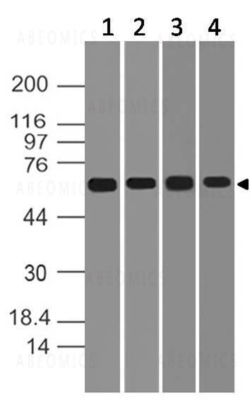Fig-1: Western blot analysis of DDX41. Anti-DDX41 antibody (11-4073) was used at 2 µg/ml on (1) K562, (2) 293, (3) 3T3 and (4) EL-4 lysates.