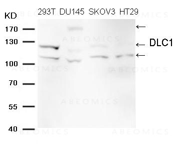 Figure 1: Western blot analysis of extracts from 293T, DU145, SKOV3 and HT29 cells using DLC1 (Ab-868) Antibody 35-1866 .