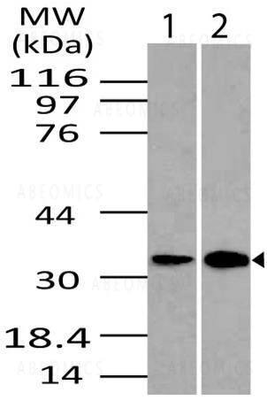 Fig-1: Western blot analysis of DRAM. Anti- DRAM antibody (11-1001) was used at 4 µg/ml on (1) Kidney and (2) Lungs lysates.