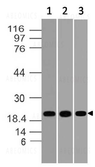 Figure-1: Western blot analysis of DUSP18. Anti-DUSP18 antibody (11-8026) was used at 0.5 µg/ml on (1) h Brain, (2) h Liver and (3) h Kidney lysates.