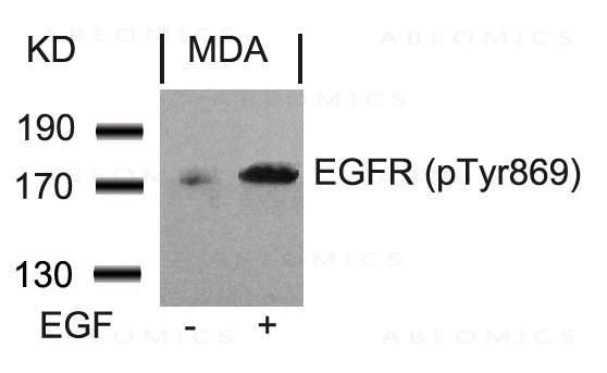 Figure 1: Western blot analysis of extracts from MDA cells untreated or treated with EGF using EGFR(Phospho-Tyr869) Antibody 35-1214 .