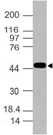 Fig-1: Western blot analysis of eIF4A2. Anti-eIF4A2 antibody (11-8048) was used at 2 µg/ml on Jurkat lysate.
