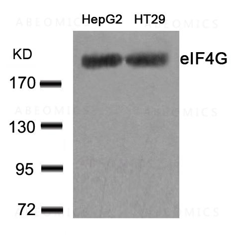 Figure 1: Western blot analysis of extracts from HepG2 and HT29 cells using eIF4G(Ab-1232) Antibody 35-1729 .