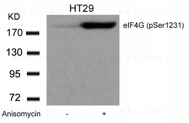 Figure 1: Western blot analysis of extracts from HT29 cells untreated or treated with Anisomycin using eIF4G (phospho-Ser1231) Antibody 35-1311 .