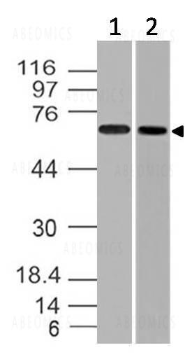 Fig-1: Expression analysis of Endoglin. Anti-Endoglin antibody (11-7552) was used at 2 µg/ml on (1) PANC-28 and (2) HCT-116 lysates.