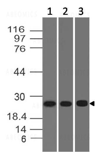 Fig-1: Western blot analysis of ERAS/GTPase ERas. Anti-ERAS/GTPase ERas antibody (11-12048) was used at 1 µg/ml on (1) h Lung, (2) h Testis and (3) h Brain lysates.