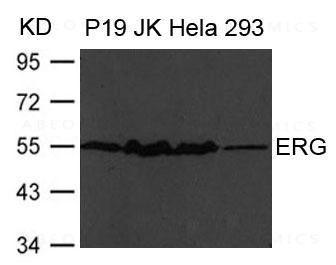 Figure 1: Western blot analysis of extract from P19, JK, Hela and 293 cells using ERG Antibody 35-1708