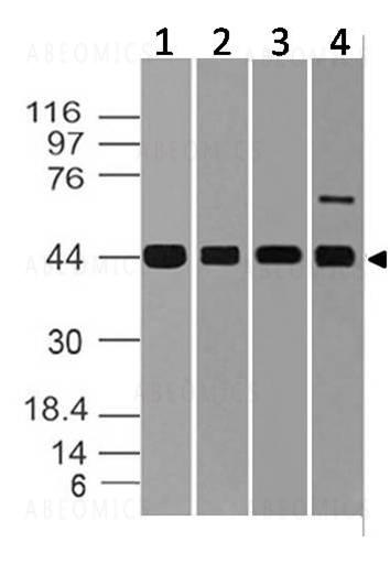 Figure-1: Western blot analysis of ERK1/ MAPK3. Anti- ERK1/ MAPK3 antibody (11-8105) was used at 1 µg/ml on (1) U87, (2) Hela, (3) Jurkat and (4) HCT-116 lysates.