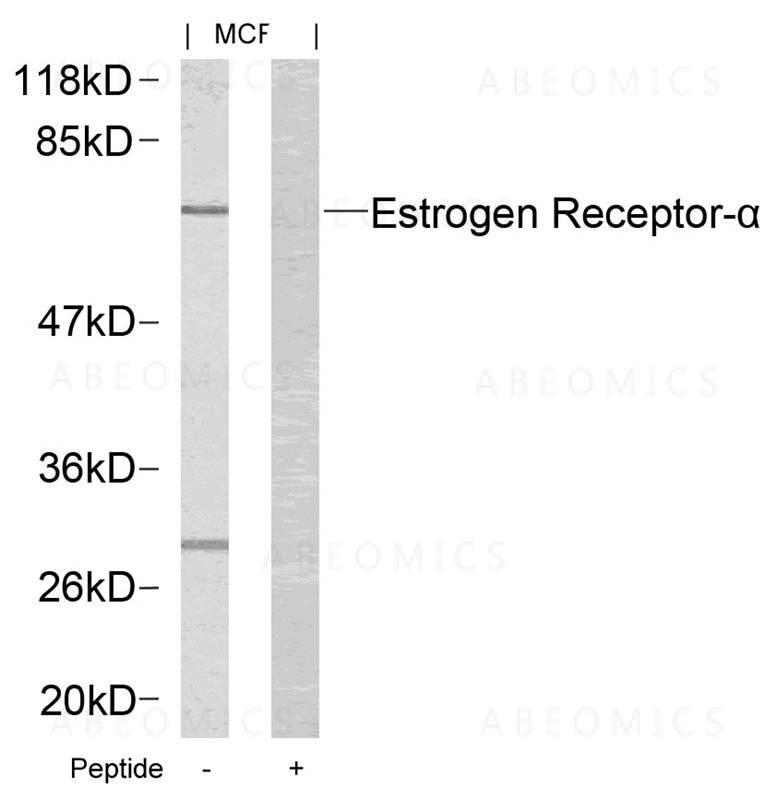 Figure 1: Western blot analysis of extracts from MCF cells using Estrogen Receptor-a(Ab-167) Antibody 35-1422 and the same antibody preincubated with blocking peptide.
