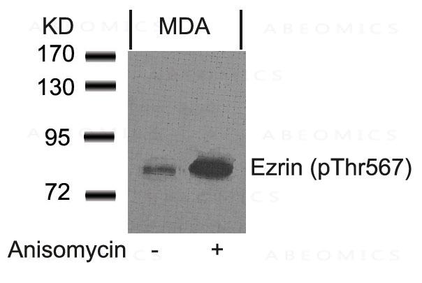 Figure 1: Western blot analysis of extracts from MDA cells untreated or treated with anisomycin using Ezrin(Phospho-Thr567) Antibody 35-1189 .