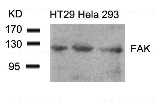 Figure 1: Western blot analysis of extracts from HT29, Hela and 293 cells using FAK(Ab-861) Antibody 35-1430 .