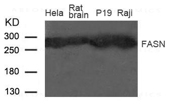Figure 1: Western blot analysis of extract from Rat brain tissue, Hela, Raji, P19 cells using Fatty Acid Synthase(FASN) Antibody 35-1775