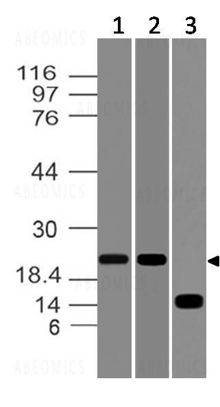 Fig-1: Western blot analysis of Ferritin, Heavy Chain. Anti-Ferritin, Heavy Chain antibody (11-7574) was used at 4 µg/ml on (1) h Liver, 2 µg/ml on (2) h Brain, and (3) Recombinant lysates.