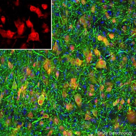 Figure-1: Immunofluorescent analysis of a rat brain section stained with rabbit pAb to FOX3/NeuN protein,(34-1036), dilution 1:2,000 in red, and costained with chicken pAb to microtubule associated protein 2 (MAP2),(34-1064), dilution 1:5,000 in green. Following transcardial perfusion of rat with 4% paraformaldehyde, brain was post fixed for 24 hours, cut to 45μm, and free-floating sections were stained with the above antibodies. The FOX3/NeuN antibody selectively stains nuclei and cytoplasm of neuronal cells, while the MAP2 antibody labels dendrites and overlaps with Fox3/NeuN staining in neuronal perikarya.