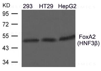 Figure 1: Western blot analysis of extracts from 293, HT29, HepG2 cells using FoxA2(HNF3b) Antibody 35-1777 .