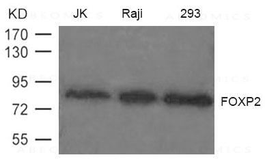 Figure 1: Western blot analysis of extract from JK, Raji and 293 cells using FOXP2 Antibody 35-1778
