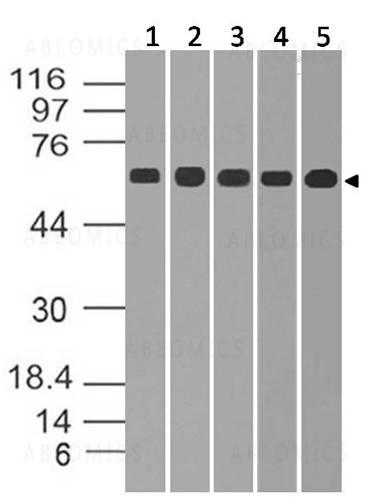 Figure-1: Western blot: Expression analysis of GAD67. Anti- GAD67 antibody (11-8104) was used at 1 µg/ml on (1) HepG2, (2) A431, (3) 293, (4) 3T3 and (5) A549 lysates.