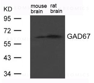 Figure 1: Western blot analysis of extract from Rat brain and Mouse brain Tissue using GAD67(GAD1) Antibody 35-1793