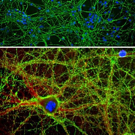 Figure-1: Immunofluorescent analysis of cortical neuron-glial cell culture from E20 rat stained with chicken pAb to GAP43,(34-1038), dilution 1:2,000 in green, and costained with rabbit pAb to α-II spectrin, (34-1109), dilution 1:1,000 in red. The blue is DAPI staining of nuclear DNA. GAP43 antibody labels protein expressed in the axonal membrane and synapses of neuronal cells, while the spectrin antibody stains the submembraneous cytoskeleton of axons and dendrites.