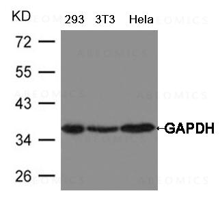 Figure 1: Western blot analysis of extract from Hela, 293 and 3T3 cells using GAPDH Antibody 35-1782