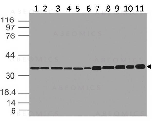 Figure-1: Western blot analysis of GAPDH. Anti- GAPDH antibody (11-13024) was used at 1 µg/ml on (1) h Brain, (2) h Heart, (3) h Small Intestine, (4) h Kidney, (5) h Liver, (6) h Lung, (7) h Skeletal Muscle, (8) h Stomach, (9) h Spleen, (10) h Ovary, (11) h Testis lysates.