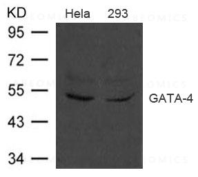 Figure 1: Western blot analysis of extract from Hela and 293 cells using GATA-4 Antibody 35-1718