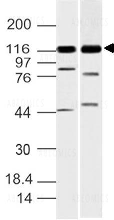 Fig-1: Western blot analysis of Grb2-associated binder 1. Anti-Grb2-associated binder 1 antibody (11-8085) was used at 4 µg/ml on (1) A431 and (2) K562 lysates.