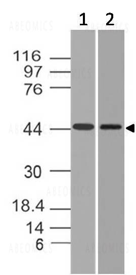 Figure-1: Western blot analysis of HCAR3. Anti-HCAR3 antibody (11-8114) was used at 2 µg/ml on (1) MOLT-4 and (2) h Kidney lysates.