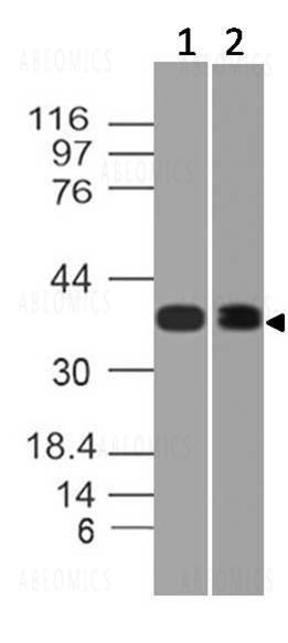 Figure-1: Western blot analysis of HDAC11. Anti-HDAC11 antibody (11-7035) was used at 4 µg/ml on (1) Hela and (2) 3T3 lysates.