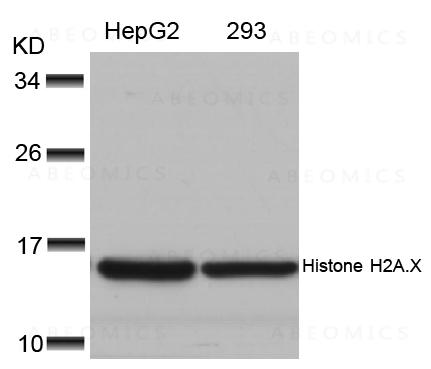 Figure 1: Western blot analysis of extracts from HepG2 and 293 cells using Histone H2A.X(Ab-139) Antibody 35-1593 .