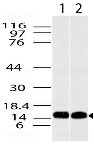 Figure-1: Western blot analysis of Histone H3.3. Anti-Histone H3.3 antibody (11-7007) was used at 2 µg/ml on (1) Raji, 2) Jurkat lysates.