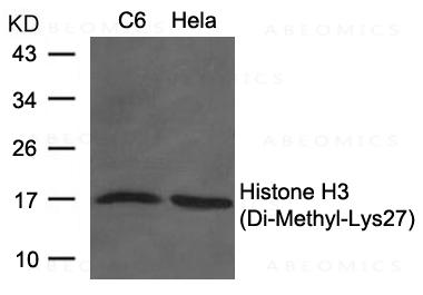 Figure 1: Western blot analysis of extracts from C6 and Hela cells using Histone H3 (Di-Methyl-Lys27) Antibody 35-1348 .
