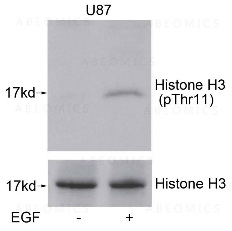 Figure 1: Western blot analysis of extracts from U87 cells untreated or treated with EGF using Histone H3(Phospho-Thr11) Antibody 35-1342 .