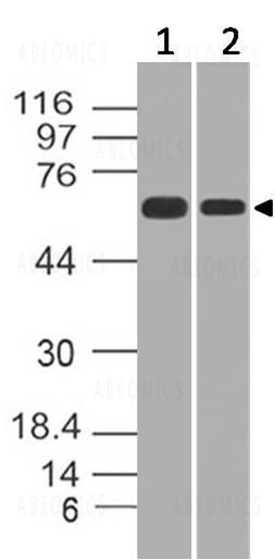 Fig-1: Western blot analysis of hnRNPK. Anti-hnRNPK antibody (11-1018) was used at 1 µg/ml on (1) 293 and (2) A549 lysates.
