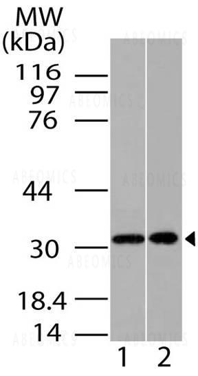 Fig-1: Western blot analysis of HOXA9. Anti- HOXA9 antibody (11-12026) was used at 2 µg/ml on 1) HCT-116 and 2) HepG2 lysates.