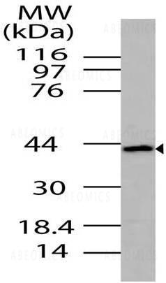 Fig-1: Western blot analysis of ICAD. Anti-ICAD antibody (11-7002) was used at 4 µg/ml on Raw lysate.