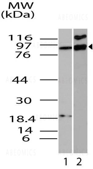 Fig-1: Western blot analysis of Interferon-activable protein 204. Anti- Interferon-activable protein 204 antibody (11-4031) was used at 3 µg/ml on 1) m kidney and 2) EL4 lysates.