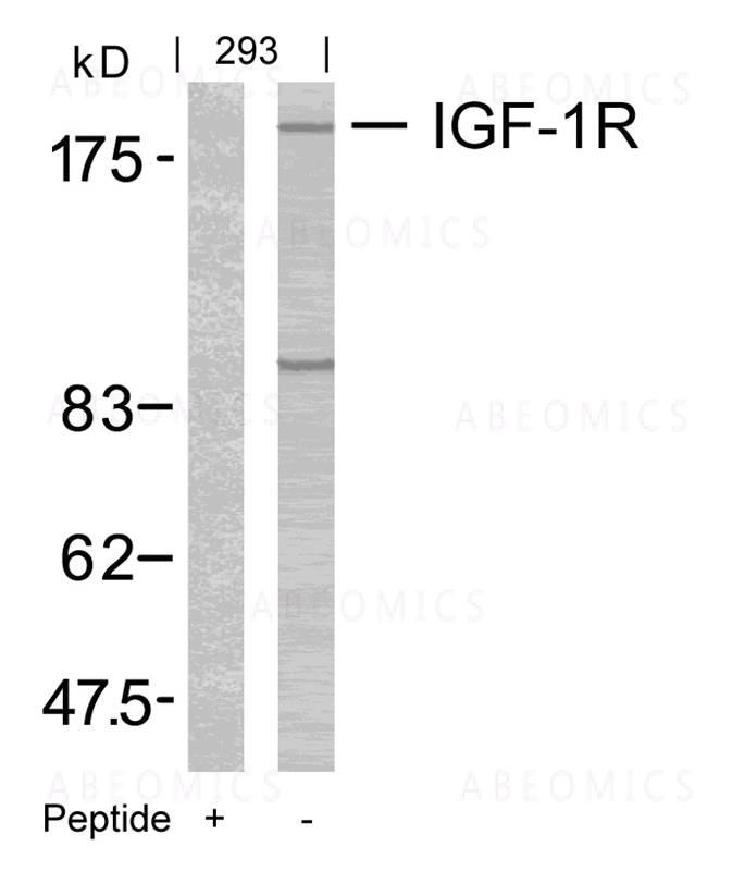 Figure 1: Western blot analysis of extracts from 293 cells using IGF-1R(Ab-1165/1166) Antibody 35-1435 and the same antibody preincubated with blocking peptide.