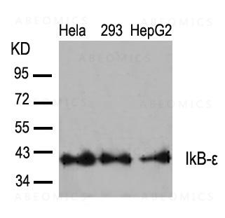 Figure 1: Western blot analysis of extracts from Hela, 293 and HepG2 cells using IkB-e(Ab-22) Antibody 35-1624 .