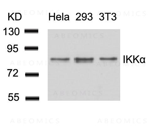 Figure 1: Western blot analysis of extracts from Hela, 293 and 3T3 cells using IKK a (Ab-23) Antibody 35-1472 .