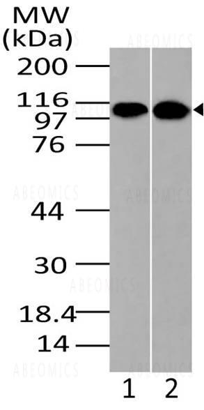 Fig-1: Western blot analysis of Importin-9. Anti- Importin-9 antibody (11-8012) was used at 0.25 µg/ml on 1) 293 and 2) 3T3 lysates.