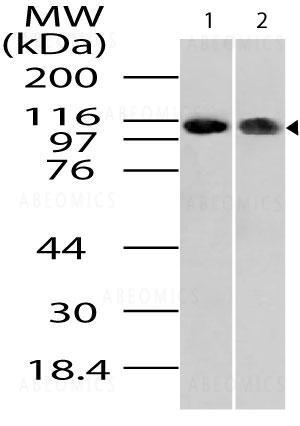 Fig-1: Western blot analysis of Importin-9 (Ran-binding protein 9) . Anti- Importin-9 (Ran-binding protein 9) antibody (11-8013) was used at 0.25 µg/ml on 1) 293 and 2) 3T3 lysates.